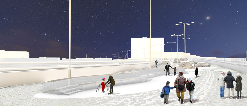 La surface minérale du viaduc est remplacée par des zones gazonnées et pierreuses afin de créer un environnement écologique dans lequel le mobilier est installé.