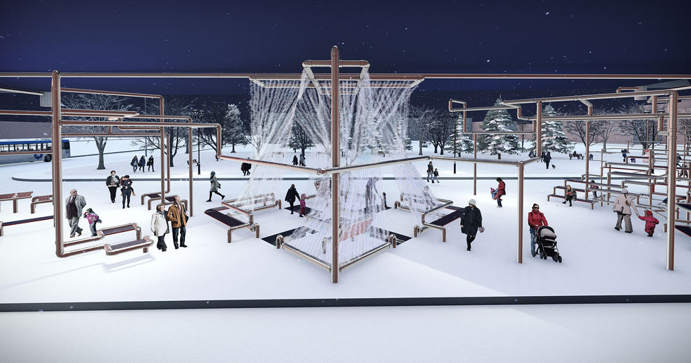 À travers un procédé de récupération de l’eau salée du viaduc, l’installation cristallise ensuite le sel sur un système de cordes qui se métamorphose ainsi lentement, au fil du temps. Venant à sa rencontre du creux de la terre, un système de mobilier chauffant géothermique se déploie dans l’espace comme une solution microclimatique dans notre environnement urbain et comme une alternative durable de notre gestion hivernale. Le langage formel de tuyaux ainsi développé s’instaure comme une architecture-manifeste à la fois urbaine et géologique, chauffée et salée, déjouant le regard blasé que l’on porte sur des éléments familiers, mais mal-aimés du paysage urbain. À long terme, le projet propose la transformation du viaduc en une ligne de chaleur géothermique alimentant le quartier.
